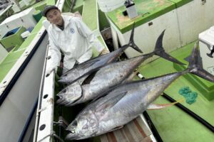 その後アタリは減りカツオがポツポツ、右舷でマグロが1本上がる。