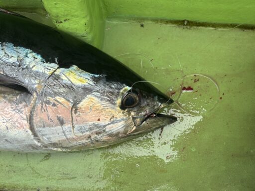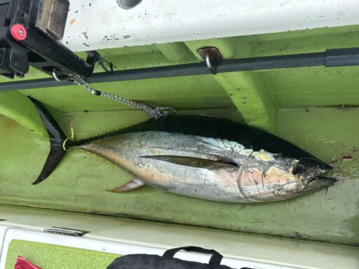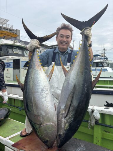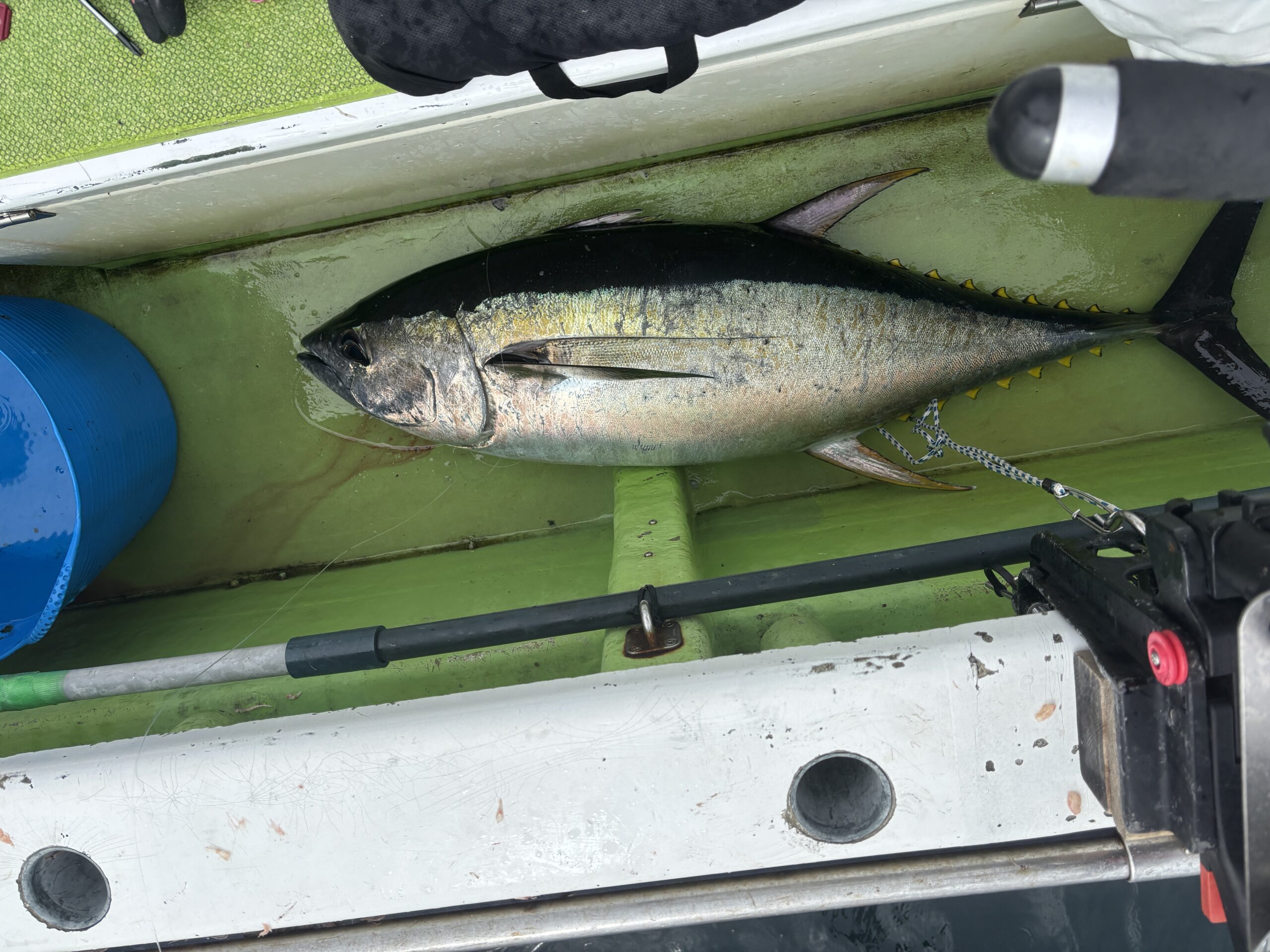 朝一からカツオの猛チャージでバタバタするも10時ごろから少し落ち着いてきて、左舷でアタリ。